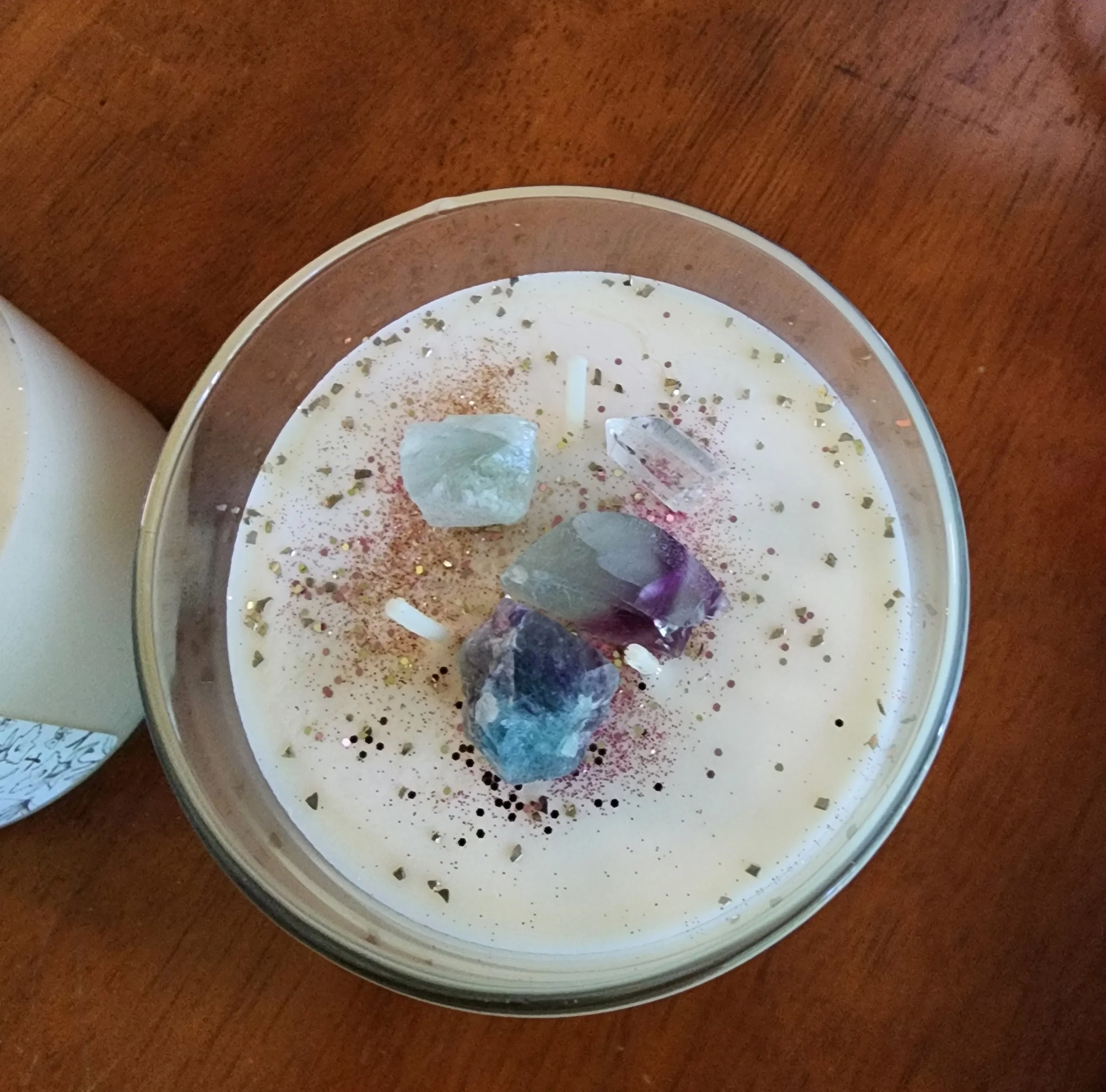 This candle is sprinkled with glitter and fluorite crystal chips for your Zen.